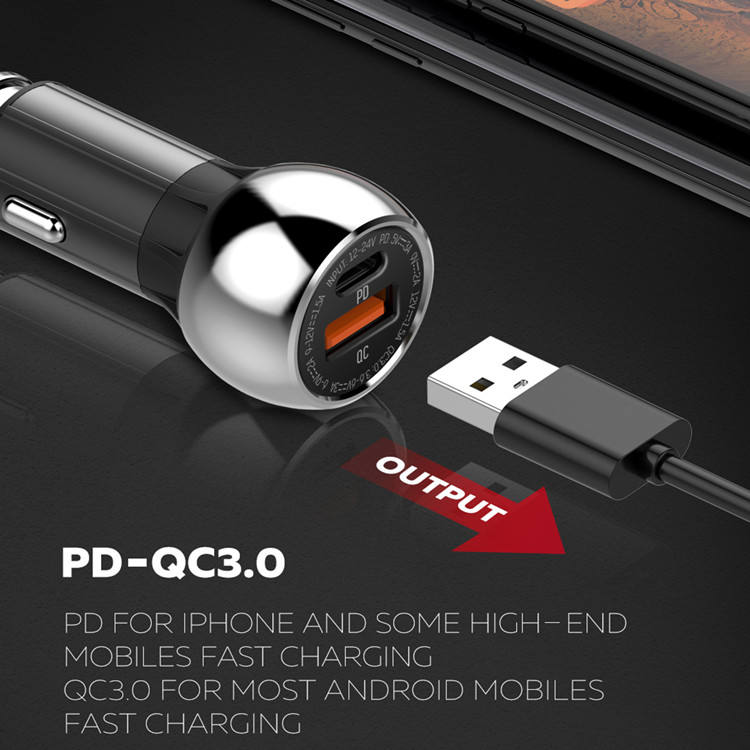 Cargador de coche LDNIO C1 de 36W con carga rapida dual PD y QC. Incluye cable de datos, compatible con iPhone y Android.